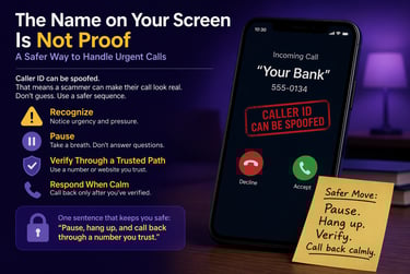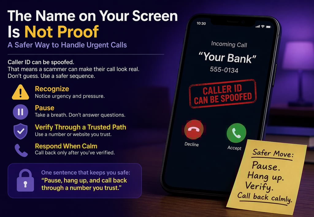 Caller ID can be spoofed, so the name or number on your screen is not enough to prove who is calling. Learn the pause and callback rule that keeps you safe.