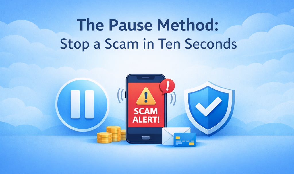 A simple ten-second pause can break a scammer’s pressure and protect your money. Use this quick script to safely verify before you click, pay, or share codes.