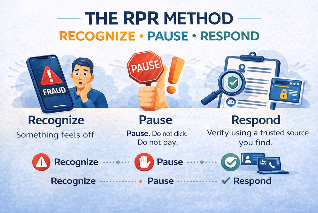 A simple, repeatable method to stop scams in real time—especially when you feel rushed or stressed. Recognize red flags, pause to create a safety gap, and respond by verifying through a trusted channel.