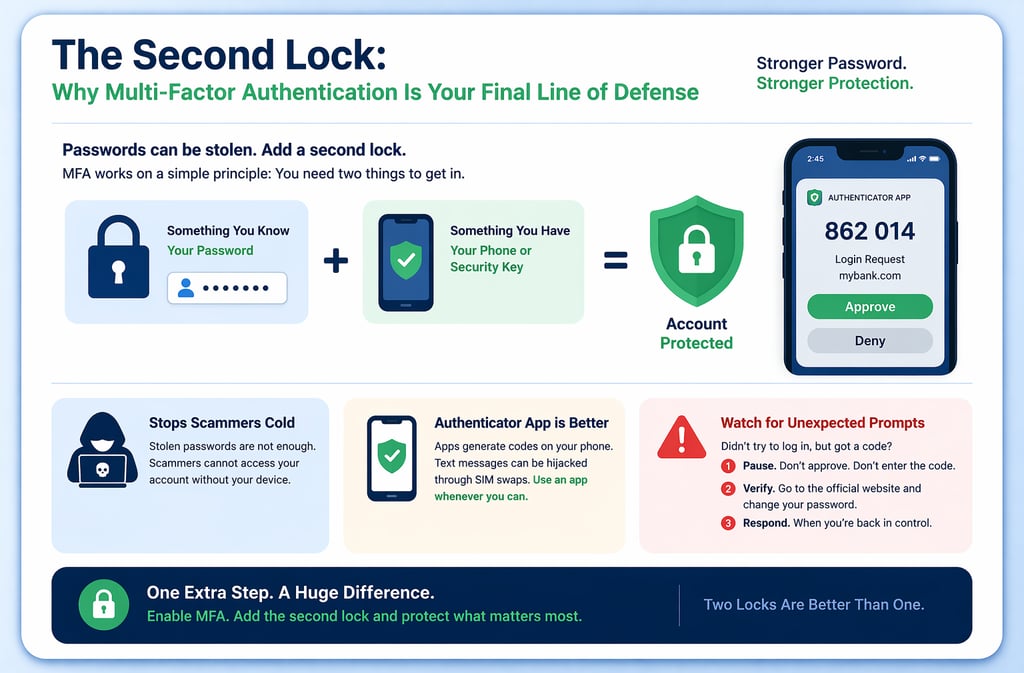MFA is not there to make your life harder. It is there to stop a criminal at the exact point where a password alone would fail. Over time, the prompt on your phone becomes part of a normal safety habit, just like locking your car or checking your front door before leaving the house.