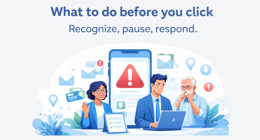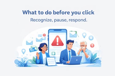 Most scams start with a message that pushes you to act fast. This simple checklist helps you pause, verify through official channels, and respond more safely using one clear framework: Recognize. Pause. Respond.