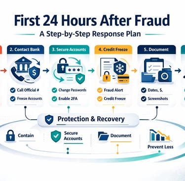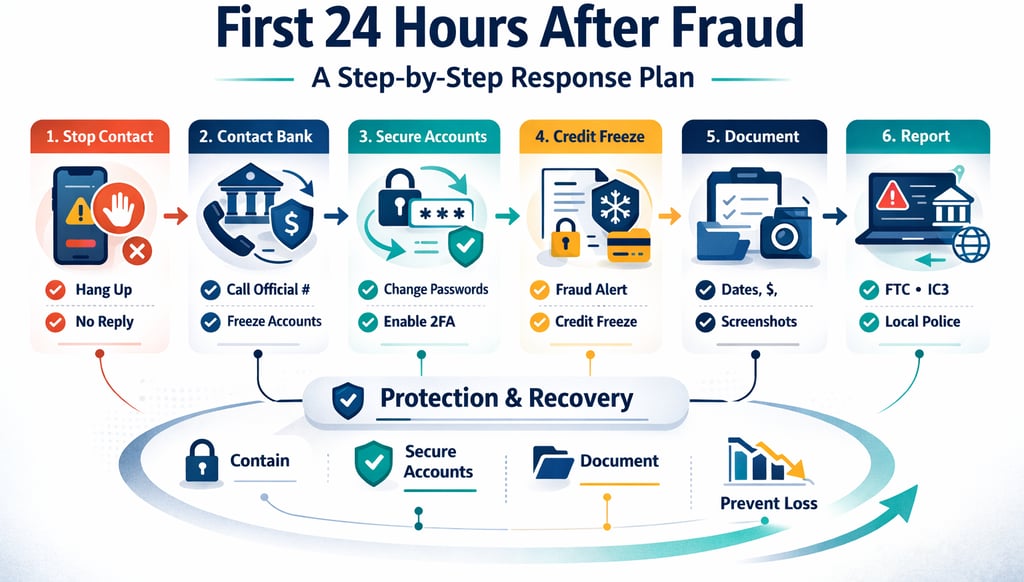 A clear, step-by-step response plan for the first 24 hours after fraud: stop contact, protect accounts, secure logins, freeze credit if needed, document, and report through official channels.